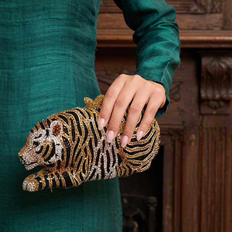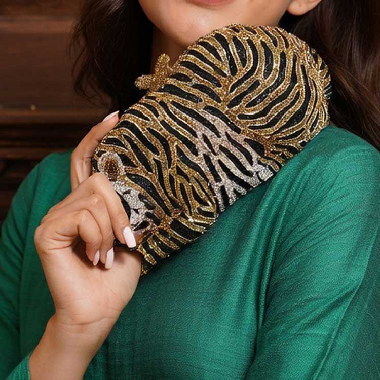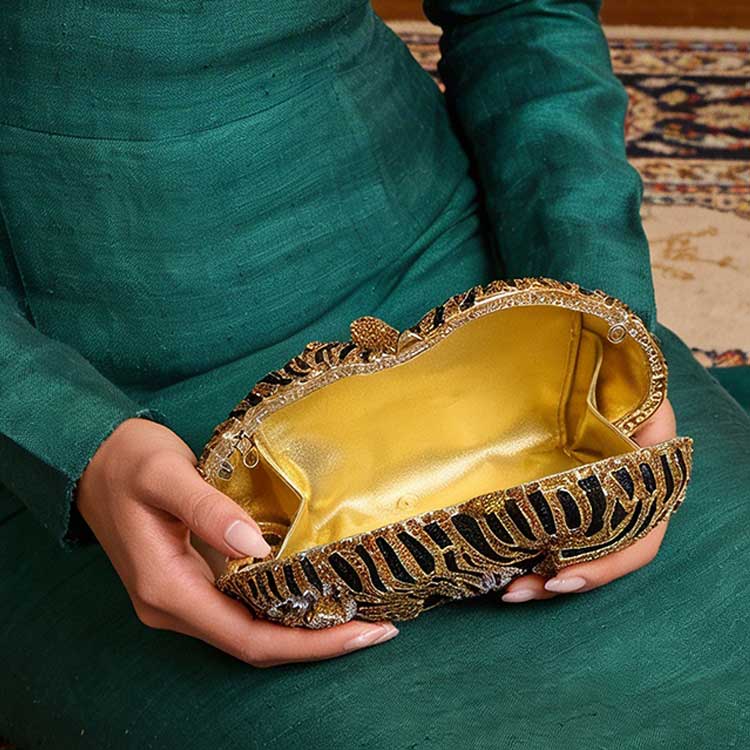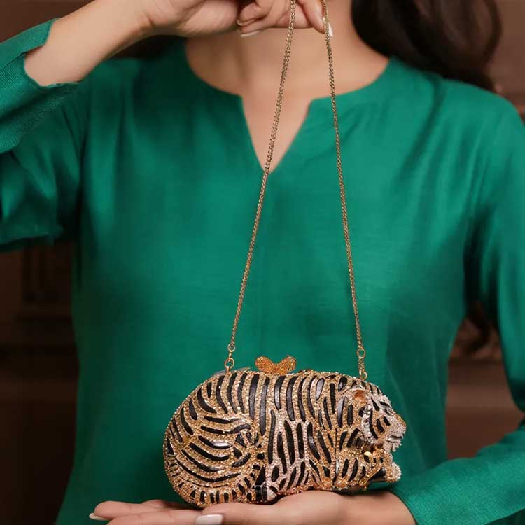 Bold and fierce, this tiger-inspired clutch dazzles with intricate crystal detailing in striking gold, black, and silver tones. Designed to make a powerful style statement, it blends wild elegance with high-glam sparkle. Perfect for parties, soirées, and standout fashion moments.